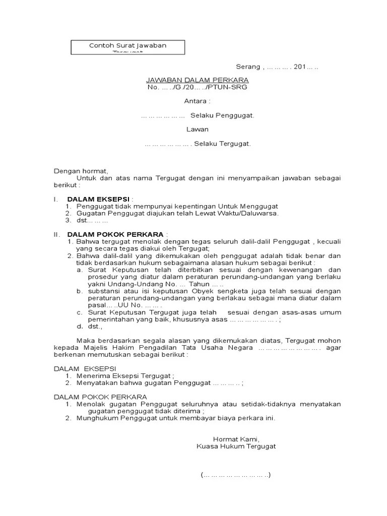 Contoh format gugatan/permohonan, jawaban, surat kuasa & permohonan insidentil. Contoh gugatan badan hukum perdataunduh. Antara posita wanprestasi atau perbuatan melawan hukum. Bahwa eksepsi tergugat angka 1 yang menyebutkan gugatan penggugat kurang subjek karena tidak menggugat kementerian hukum dan hak asasi. Contoh surat jawaban disertai gugat balasan dan eksepsi : .